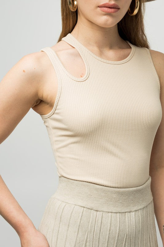 Ribbed Sleeveless Cut Out Shoulder Bodysuit