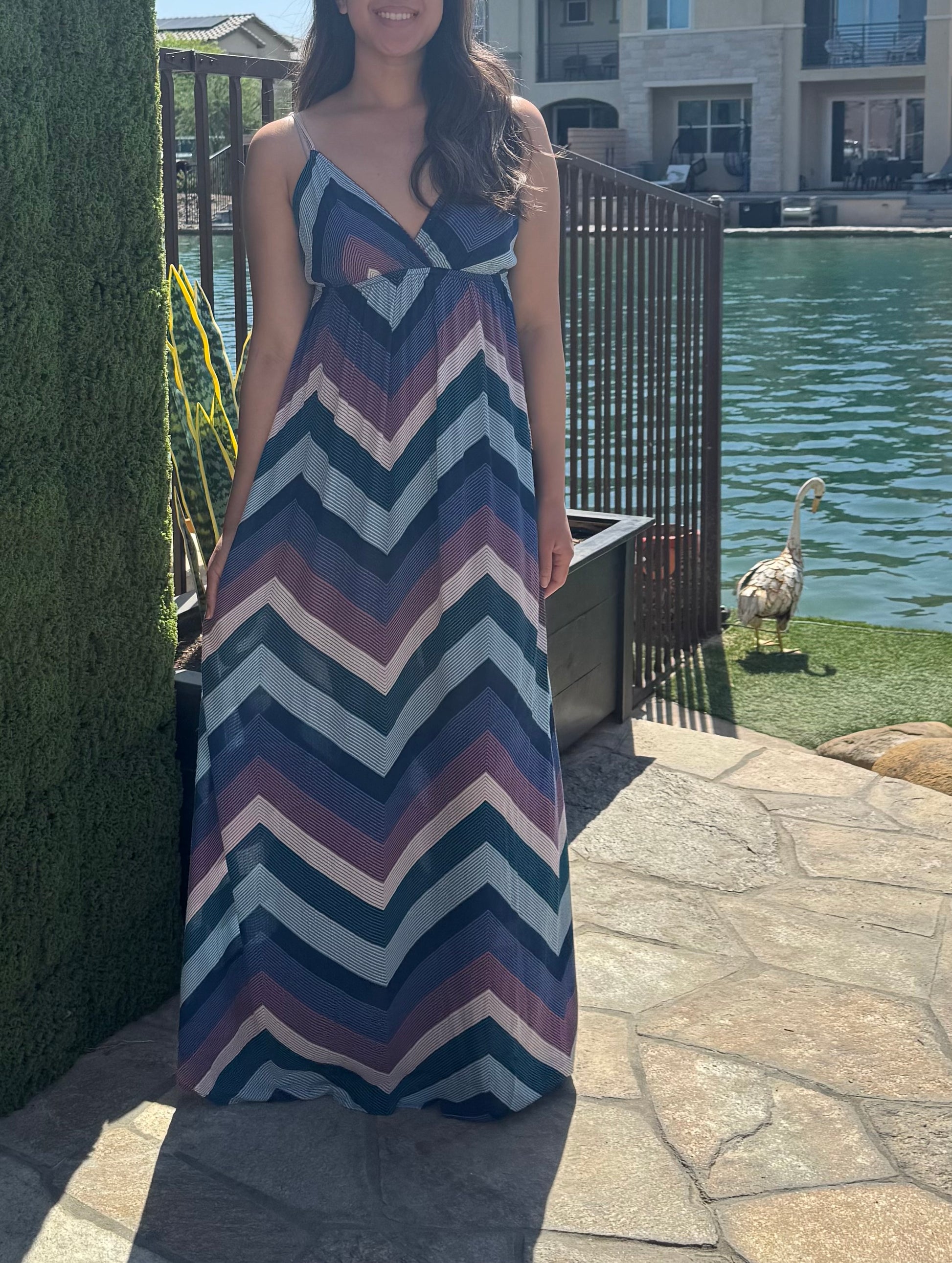 Colorful maxi dress with chevron stripes and a flattering v-neckline to keep you cute and comfy on errand run or beach day.