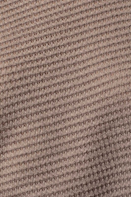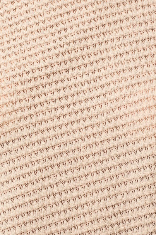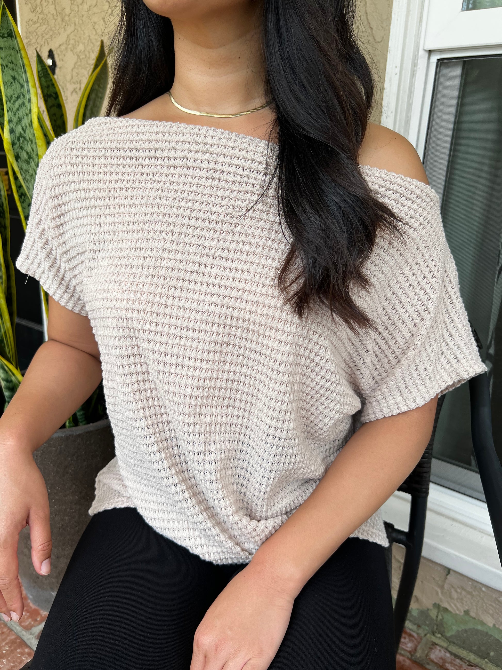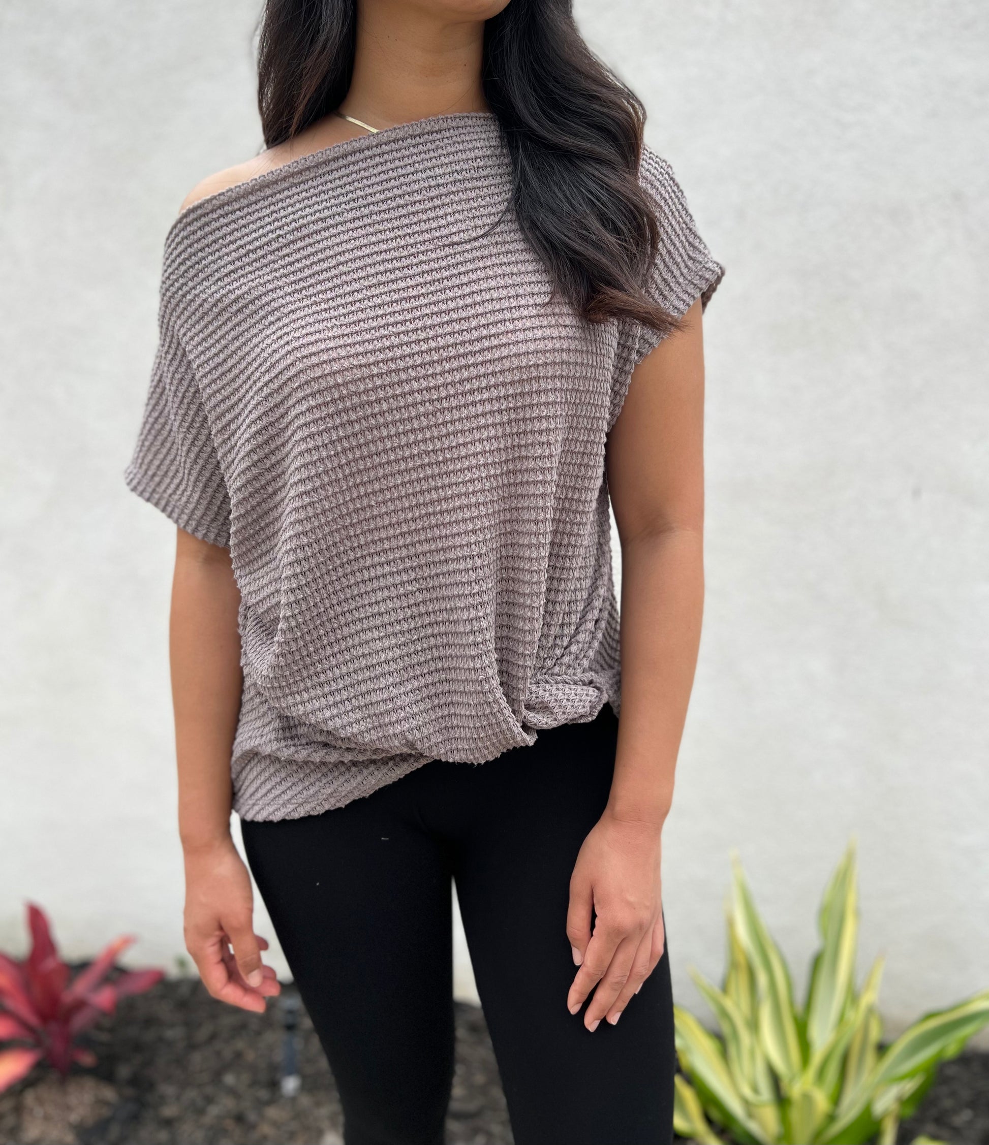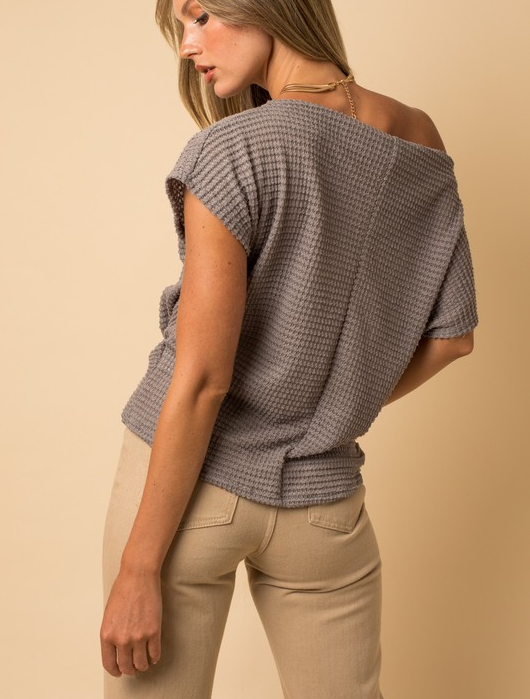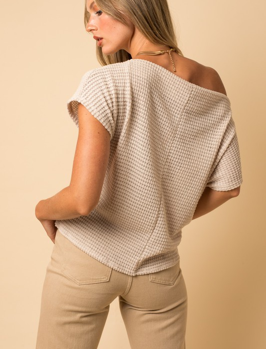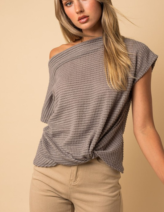 Casual boat neck style has a popcorn waffle knit texture and a front twisted detail. Top can be worn on or off one-shoulder.